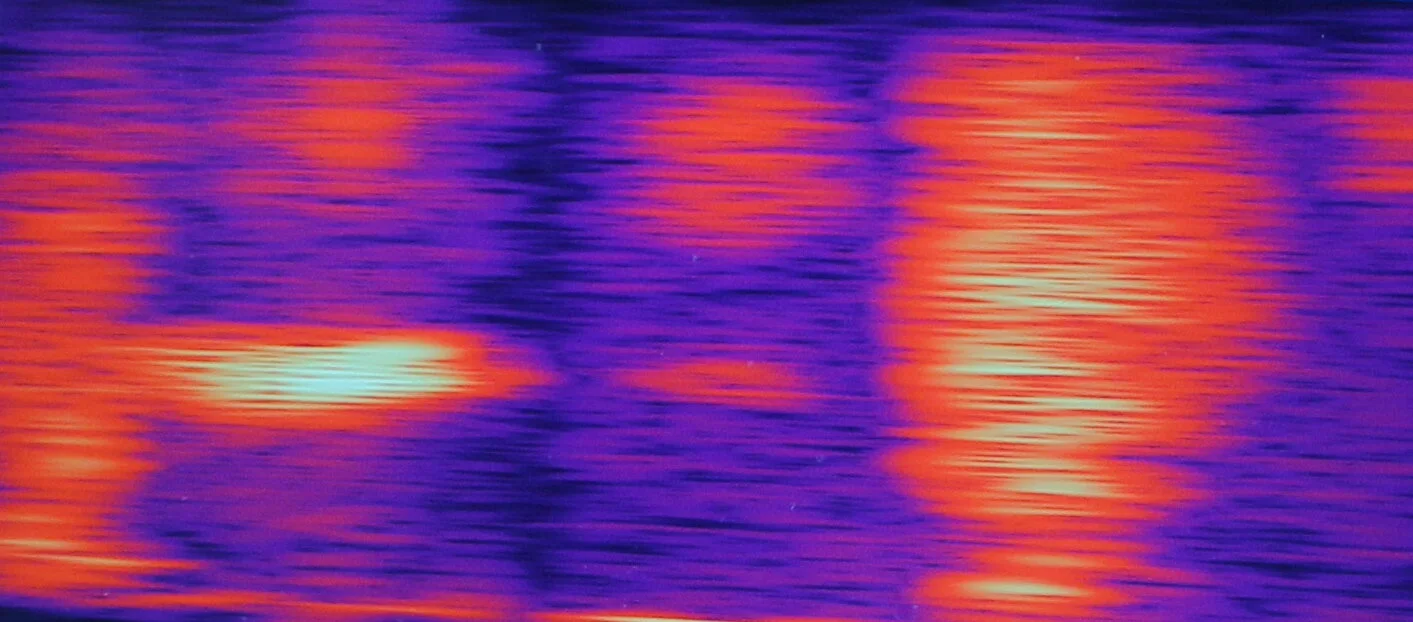 Image alt text: A close up picture of a speech spectrogram with bright purple, dark blue, and deep red, orange and yellow frequency bands.